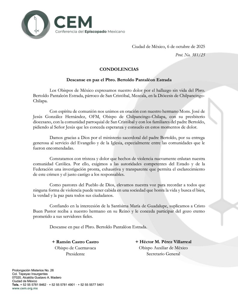 Condolencias ante la muerte del Pbro. Bertoldo Pantaleón Estrada, de la Diócesis de Chilpancingo- Chilapa.