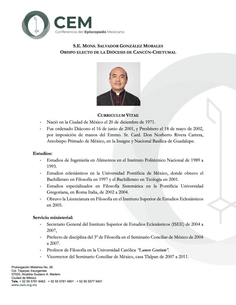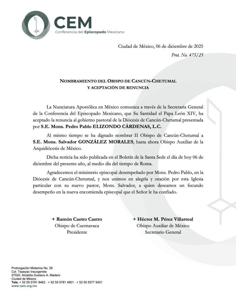 Nombramiento del Obispo de Cancún-Chetumal y Aceptación de Renuncia